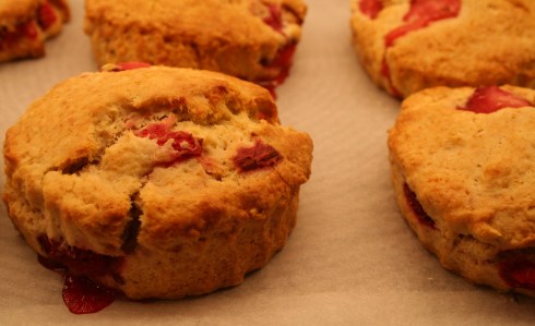 Once they were out the oven and slightly cooled, I pried a butter knife into the side of one and gently split the crumbly scone. Impatiently I dolloped ruby jam on it and topped it with freshly whipped vanilla cream. I had just one bite, and it was sublime. It’s hard to tell whether this was down the quality of the scone, or my anticipation of something sweet and forbidden. That aside, I think baking ripe strawberries and cream into scones creates an additional layer to this simple pleasure. Don’t be afraid to use overly ripe, slightly squidgy strawberries – they will just become stickier, sweeter and more melty.