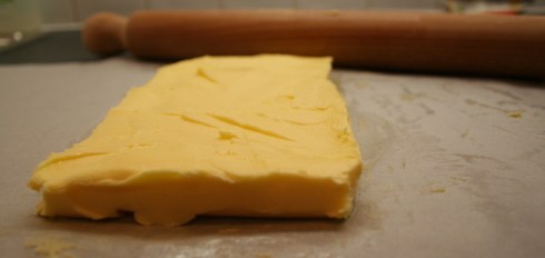 While the dough is cooling, take the chilled butter out of the fridge and place on a sheet of grease proof paper. Using a rolling pin beat the block down into a square of about 19cm by 19cm. Once beaten the exact rectangle dimensions can be scraped and spread out using a butter knife or spatula. The idea is get the butter into a cold, spreadable consistency without it warming up and becoming melted and oily. If this happens refrigerate until cold again.