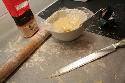 Cut the dough equally into thirds – with each piece being roughly 10cm wide by 15cm long. Place one piece on a lightly floured surface and the other two wrapped in grease proof paper and back in the fridge. It is very important to keep the dough as cold as possible otherwise it will become difficult to handle.
