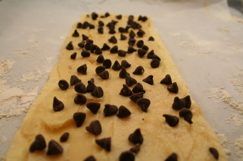 Using a spatula or the back of spoon liberally spread a layer of crème pâtissière all over the dough. Then sprinkle as many chocolate chips on top as suits your taste. Using a sharp knife cut the dough into three long strips. Each strip should be just over 3cm wide and 30cm long.