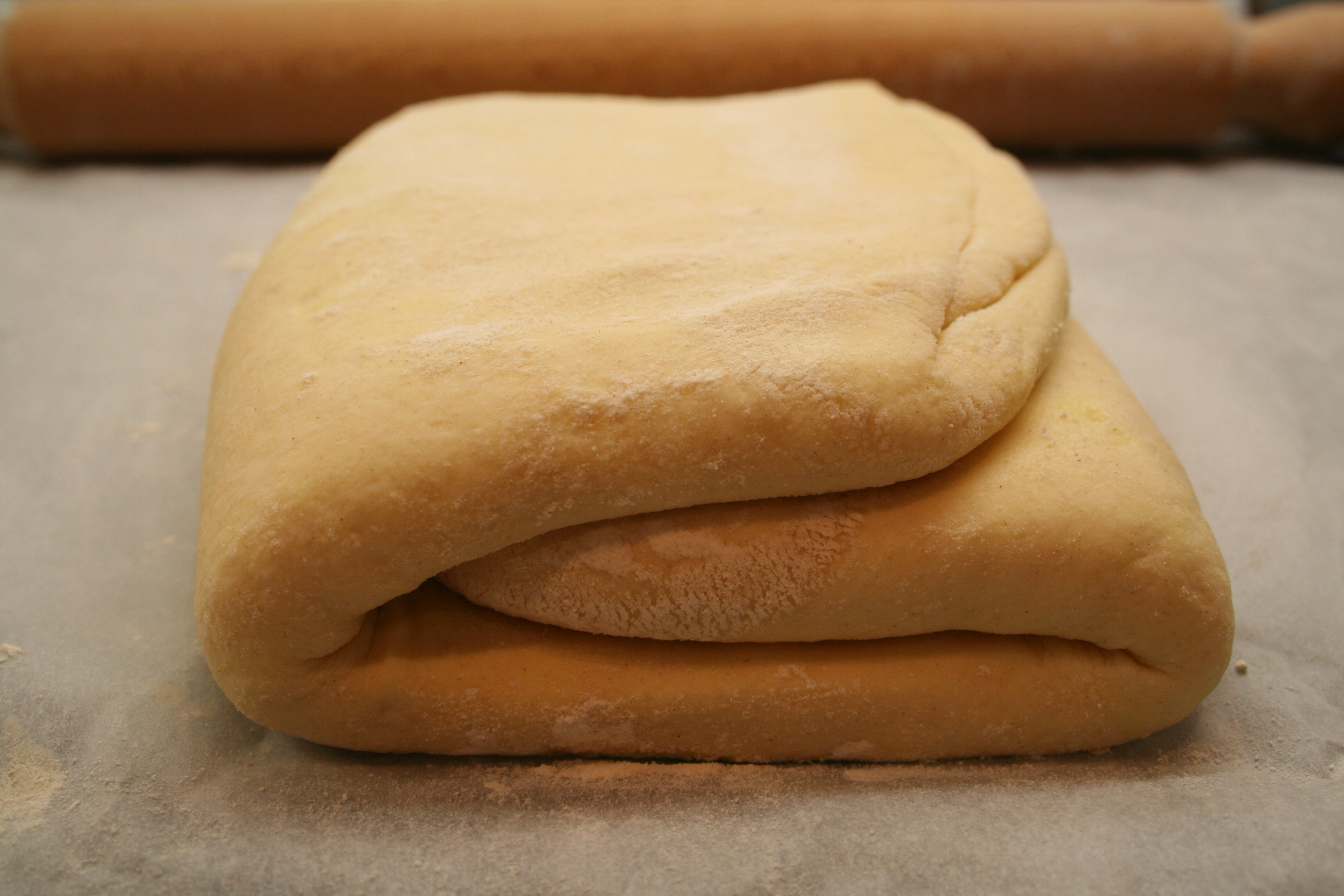 Lightly flour the top of the dough, and using a rolling pin roll the dough rapidly lengthways to elongate the rectangle. When about double in length, fold the dough to halve it widthways and continue rolling until about 5mm thick. The size of the rectangle then should be about 10cm wide by 30cm long.