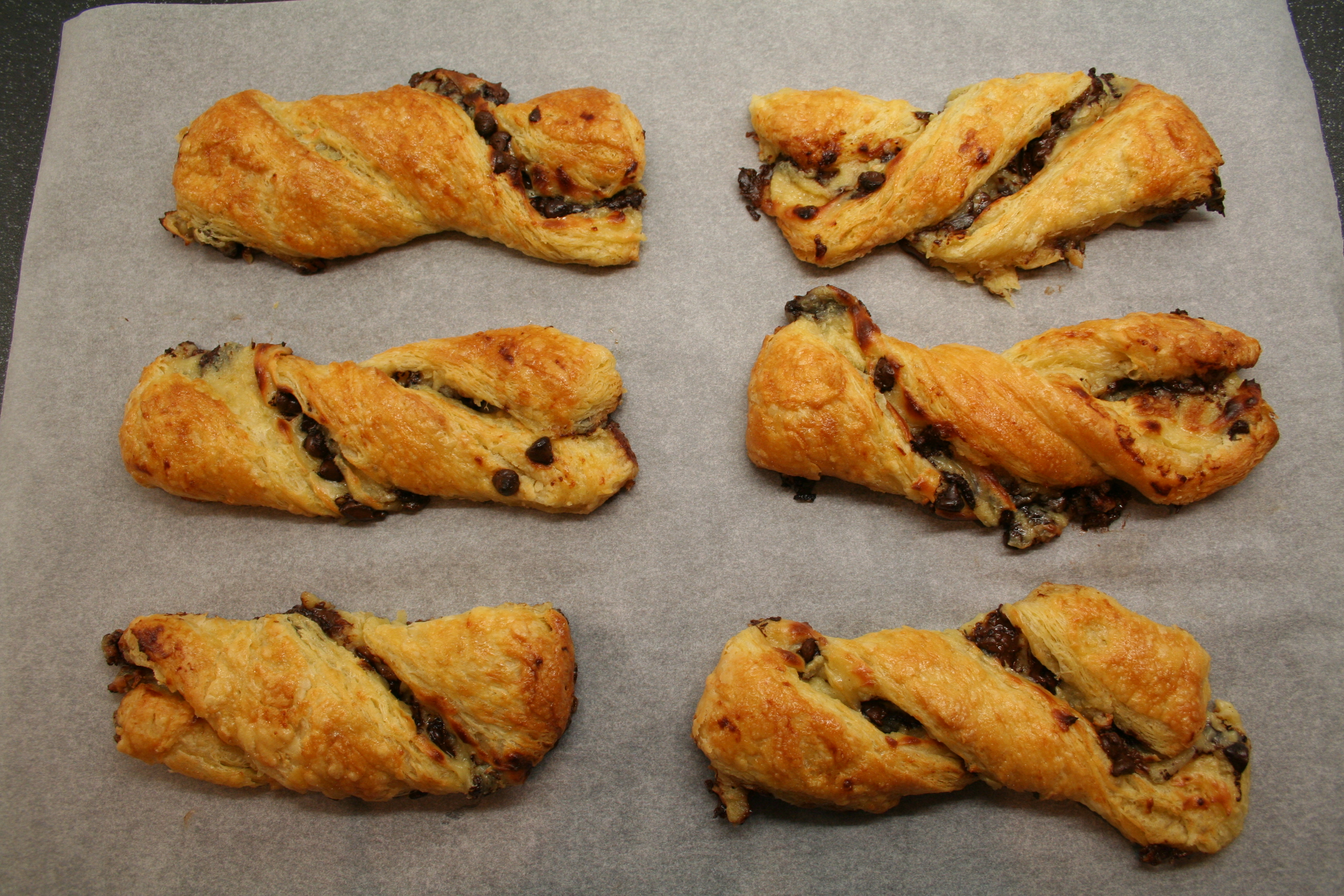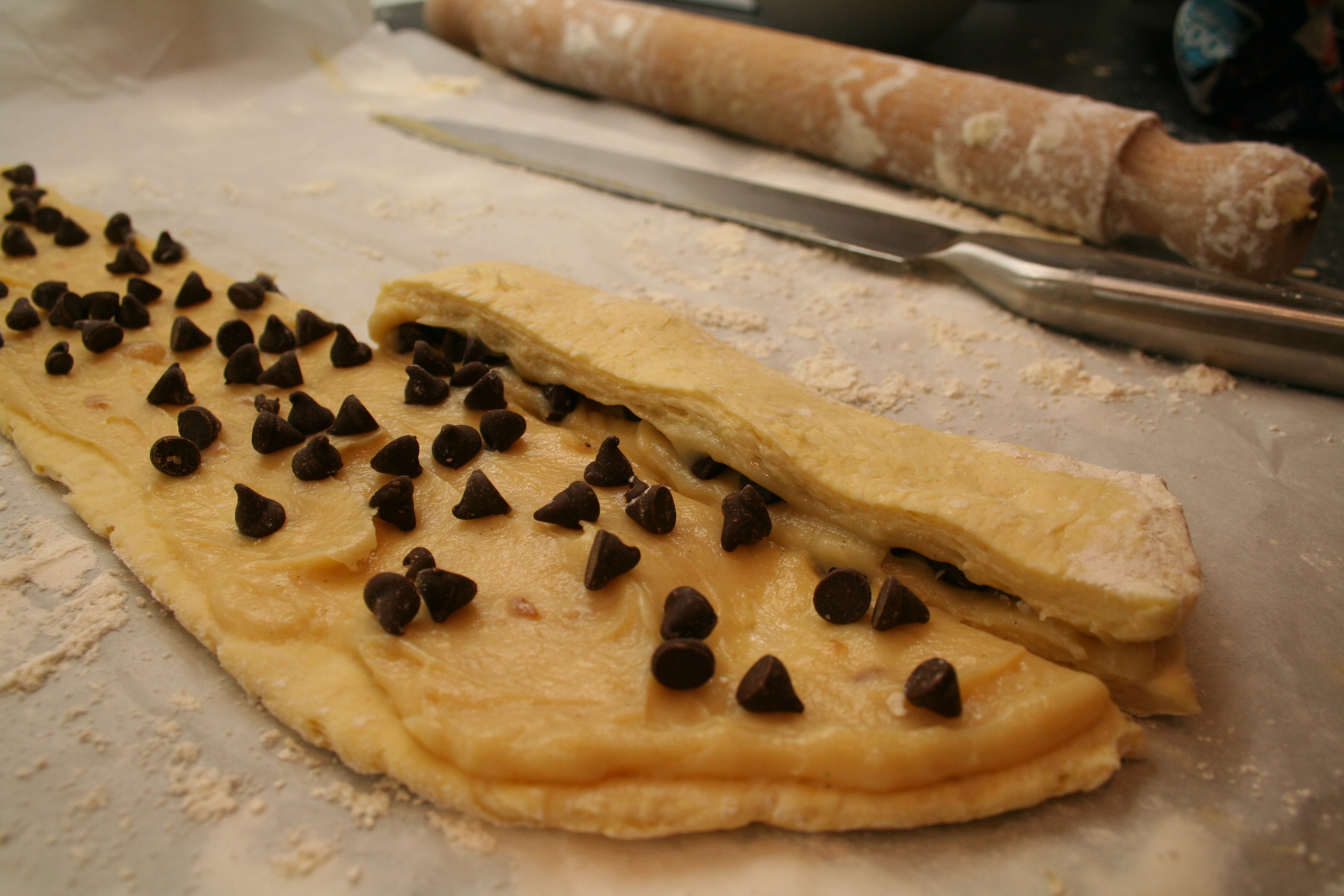 Using a spatula or the back of spoon liberally spread a layer of crème pâtissière all over the dough. Then sprinkle as many chocolate chips on top as suits your taste. Using a sharp knife cut the dough into three long strips. Each strip should be just over 3cm wide and 30cm long.