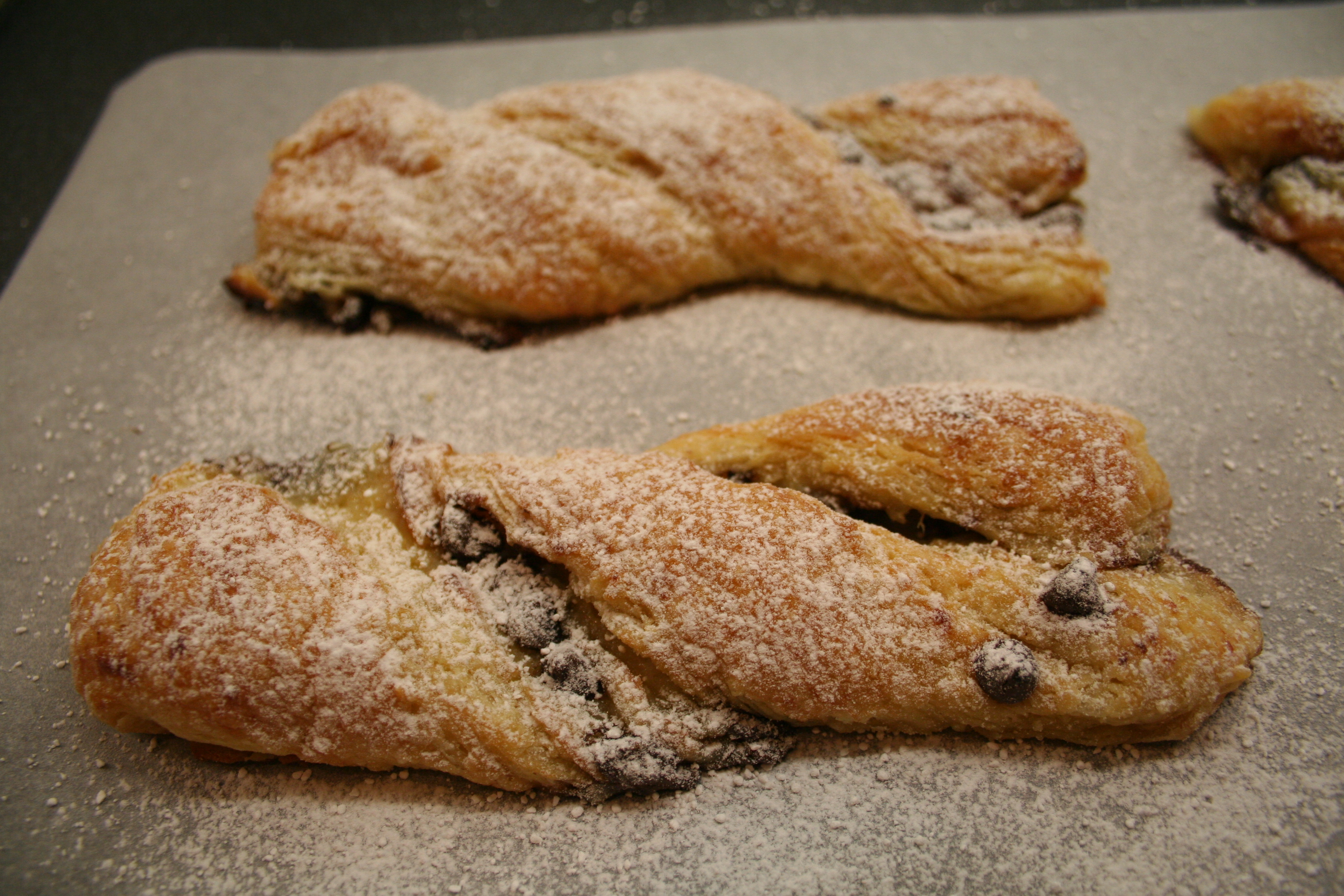 Before baking, the dough needs one final rise. Cover chocolate twists loosely with cling film place in a spot where the temperature is about 21°C-22°C for about an hour. The dough should almost double in size and feel light and springy when touched. If it does not rise, once baked the pastry will be hard and heavy instead of puffy and light. In hot weather it may be necessary to refrigerate the dough from time to time to prevent the butter from softening and oozing out.