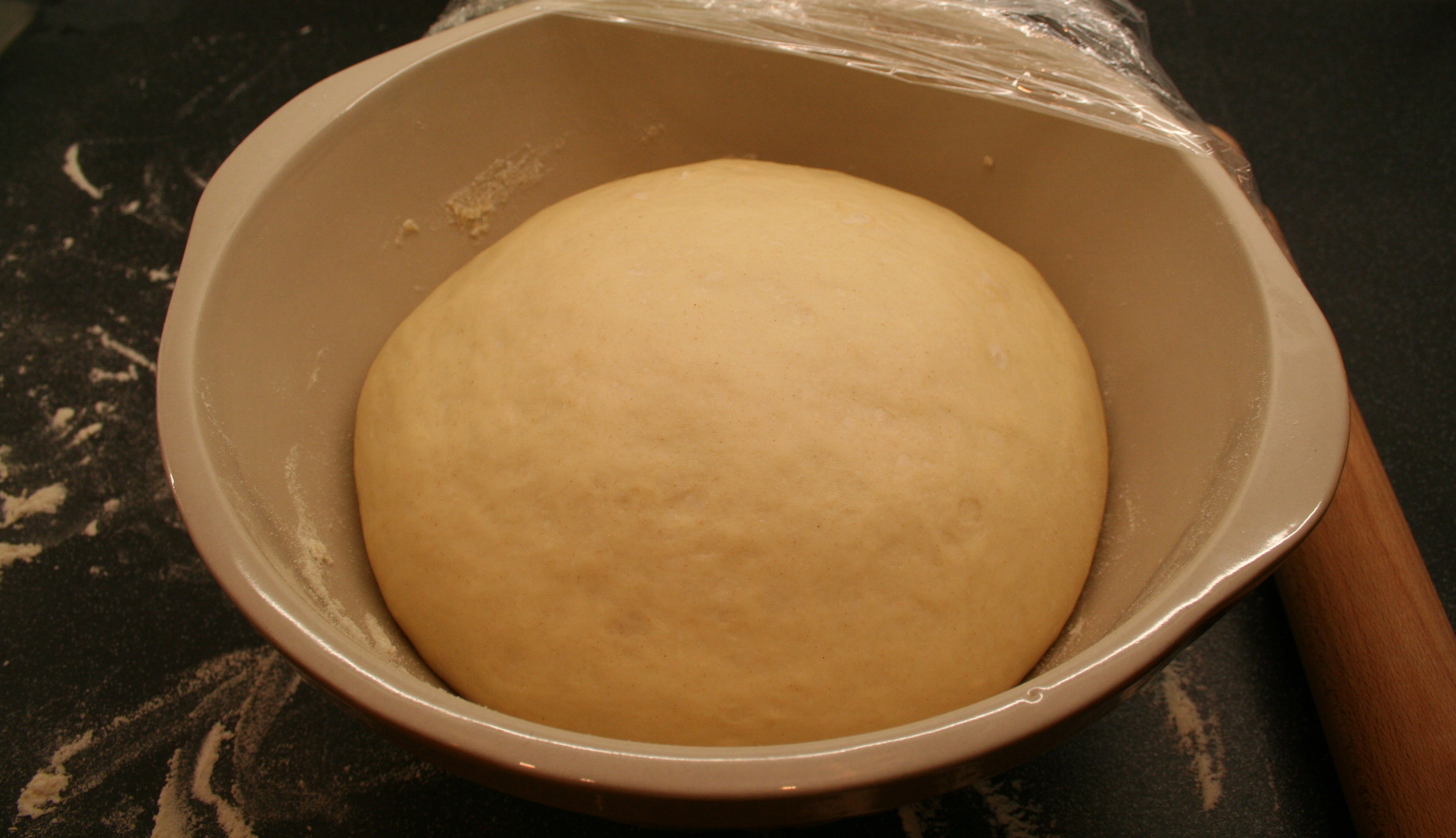 The dough will now be considerably less sticky. Knead the dough with the palms of your hands for about five minutes until it becomes soft and silky. Place back in the bowl, cover with cling film and leave to rise in a warm place for about an hour. The dough should double in size.