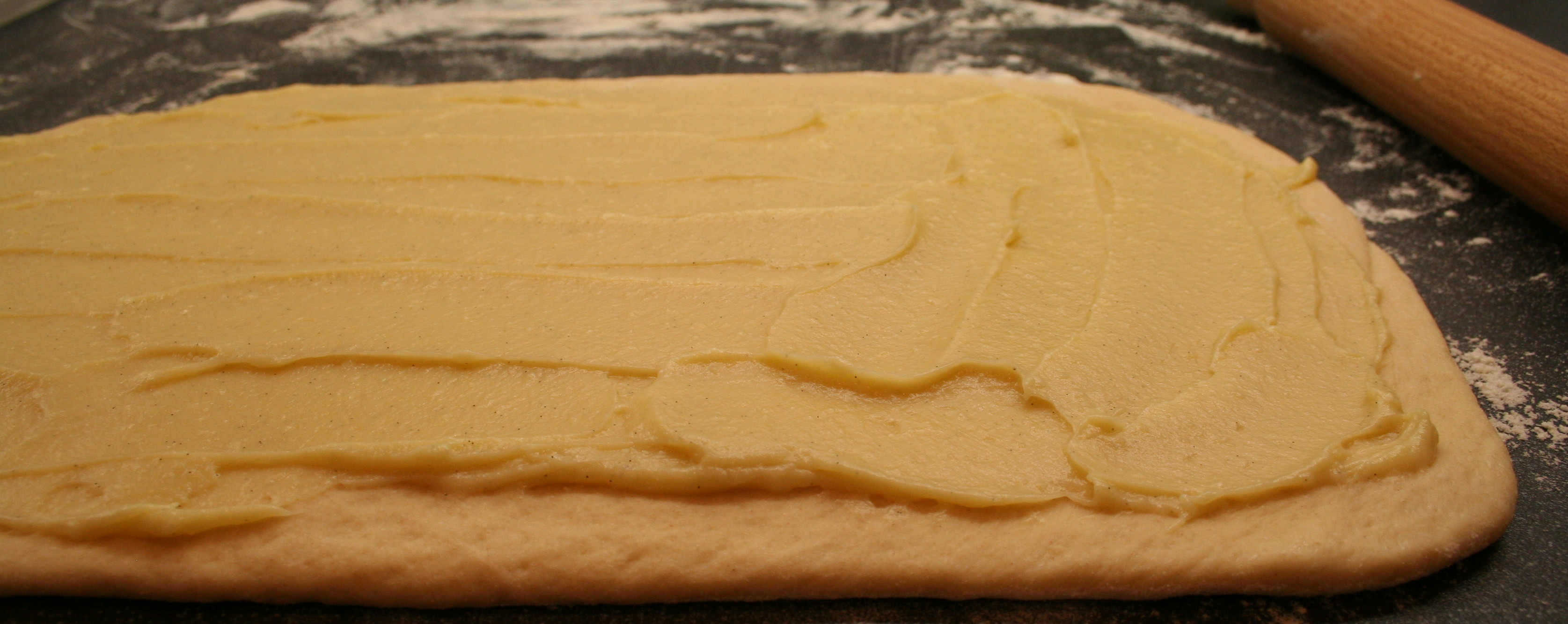 On a lightly floured surface roll the bun dough out into a rectangle measuring about 25cm wide by 40cm long. Spread the pastry cream evenly onto the dough leaving a 2cm border around the edge.
