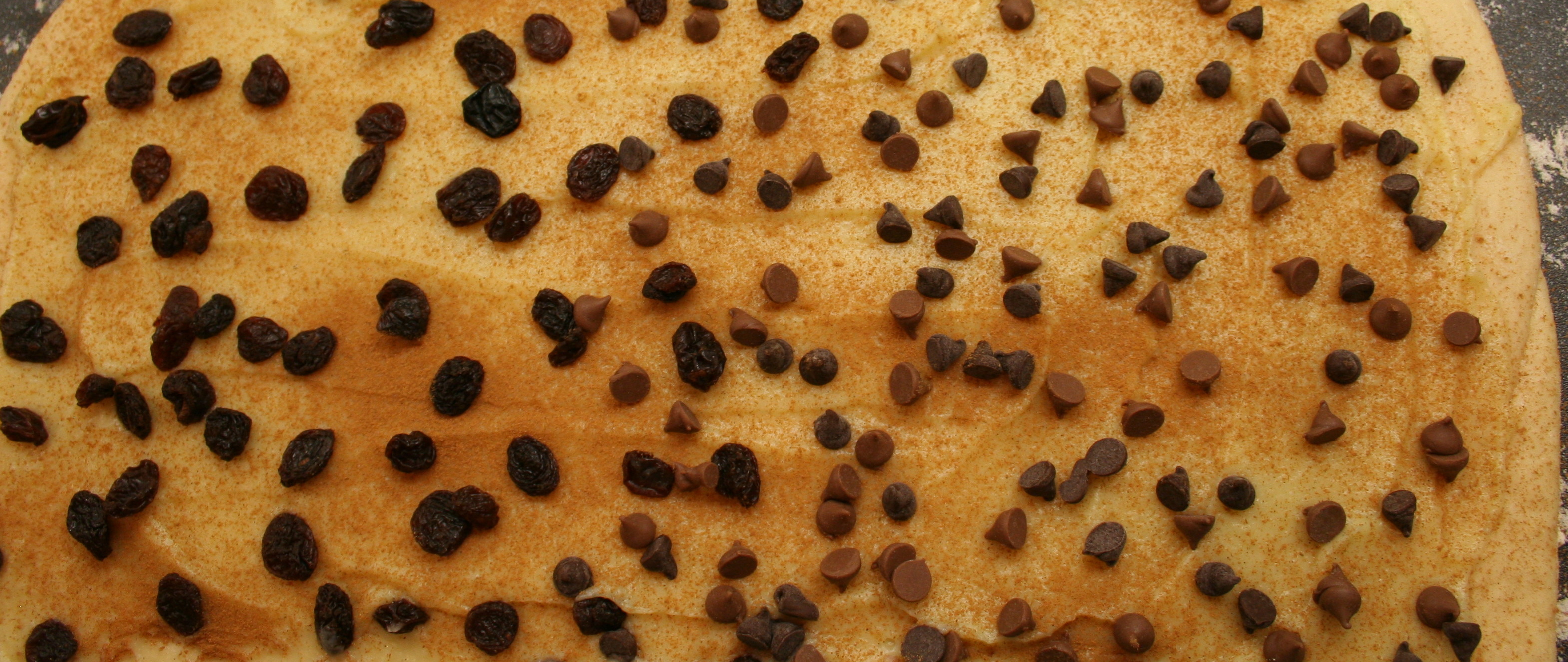Sprinkle the cinnamon and raisins and or chocolate chips over the pastry cream.