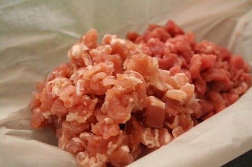 When chopping the pork ensure you remove all white sinew strips. Dice into 5mm pieces.
