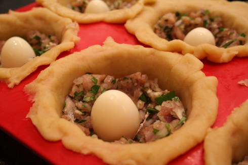Spoon a little of the mixture into each lined pie case, place a quail’s egg in the centre and spoon more filling around it. The filling should fit snugly in the pastry case and over the top of the egg.
