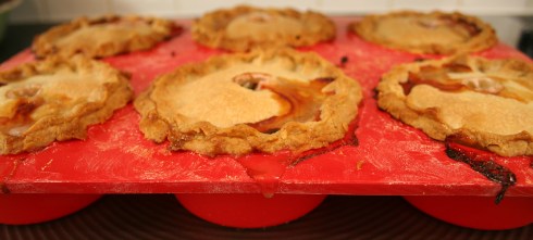 Roll the pastry out to a thickness of about 3mm. Cut out six 15cm circles and use these to line a holes in the muffin tin. Cut out six 10cm circles for the lids. Using a piping nozzle (or any other pointy kitchen implement) make a hole in the middle of each circle and gently widen it with a circular motion. Set the lids aside.