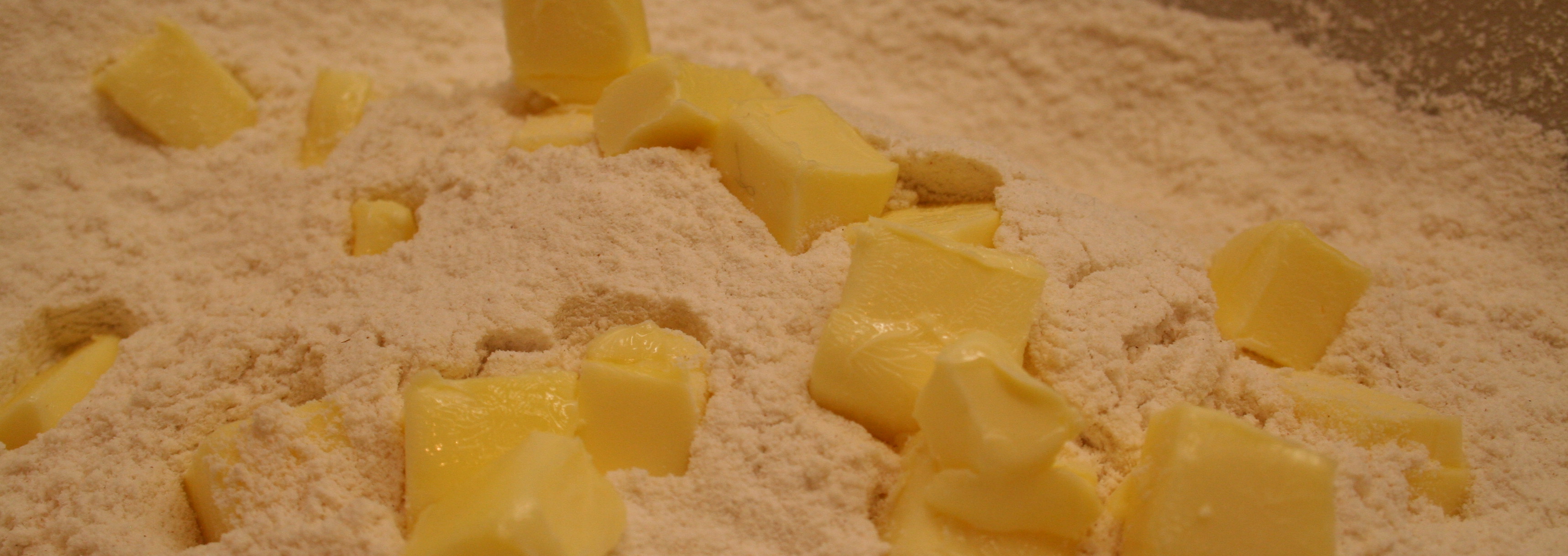 Sift the flours into a bowl, dice the butter and rub it into the flour until the mixture resembles breadcrumbs. In a small saucepan bring the water and salt to the boil, then add the lard and stir until the lard has melted.