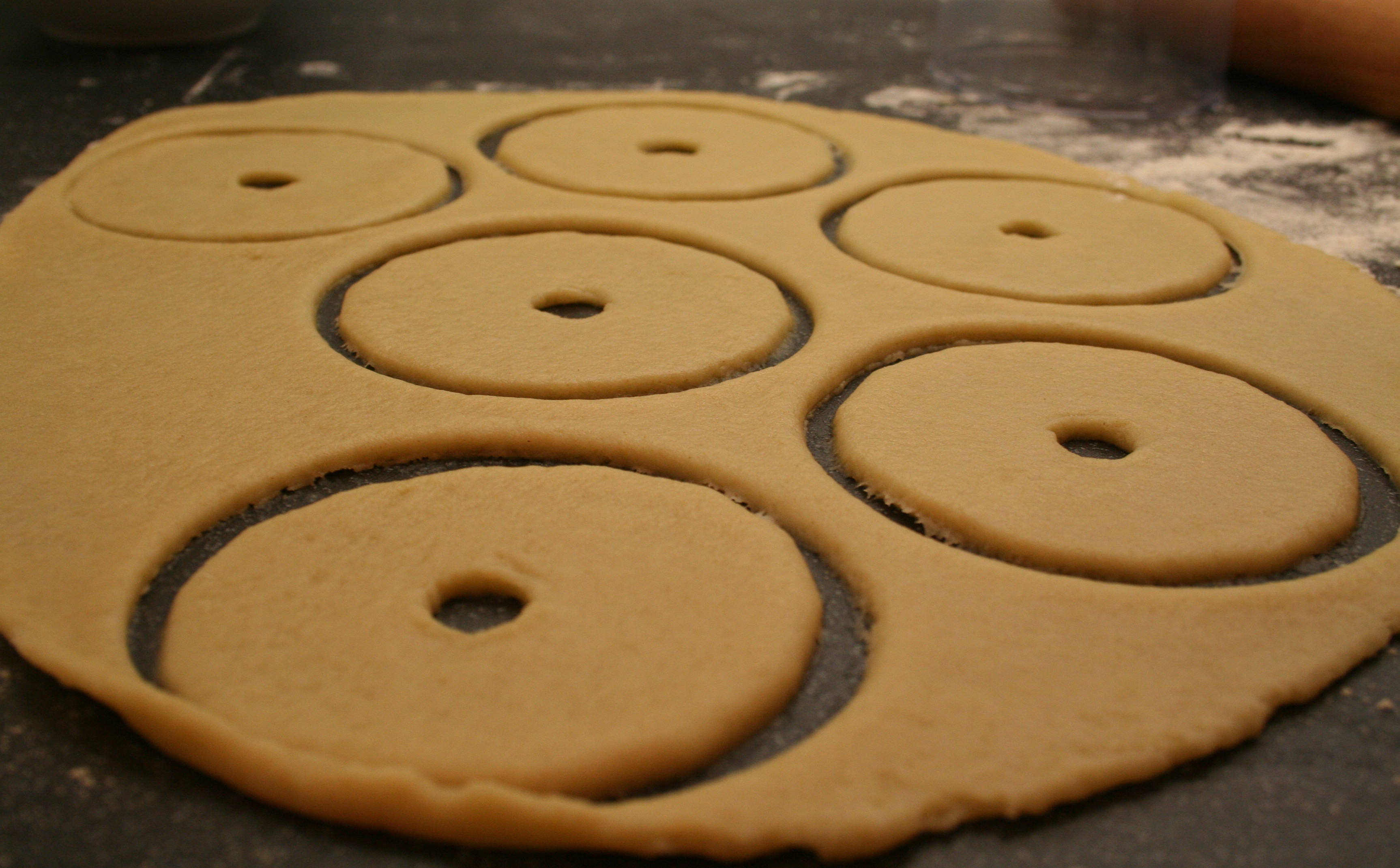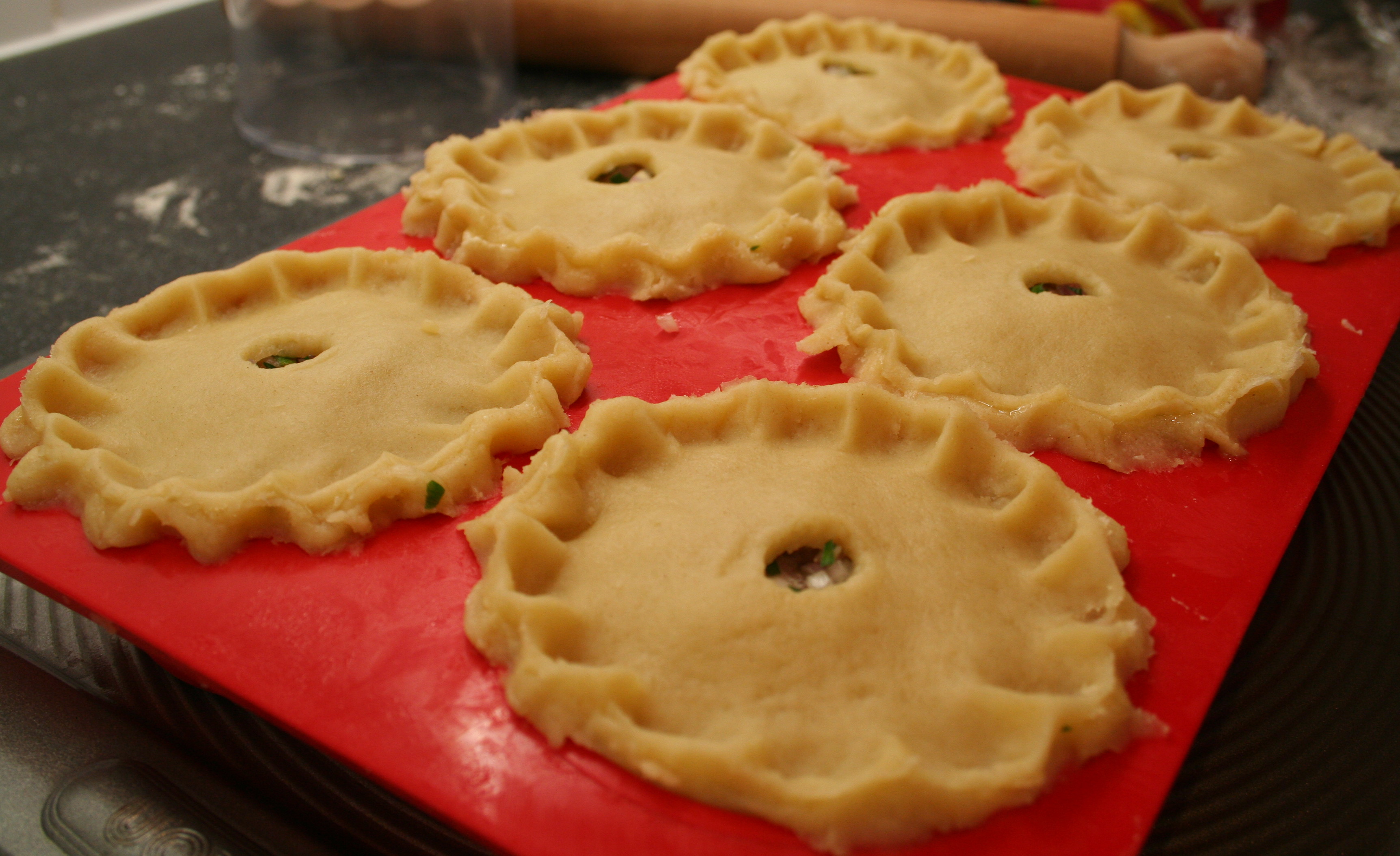Roll the pastry out to a thickness of about 3mm. Cut out six 15cm circles and use these to line a holes in the muffin tin. Cut out six 10cm circles for the lids. Using a piping nozzle (or any other pointy kitchen implement) make a hole in the middle of each circle and gently widen it with a circular motion. Set the lids aside.