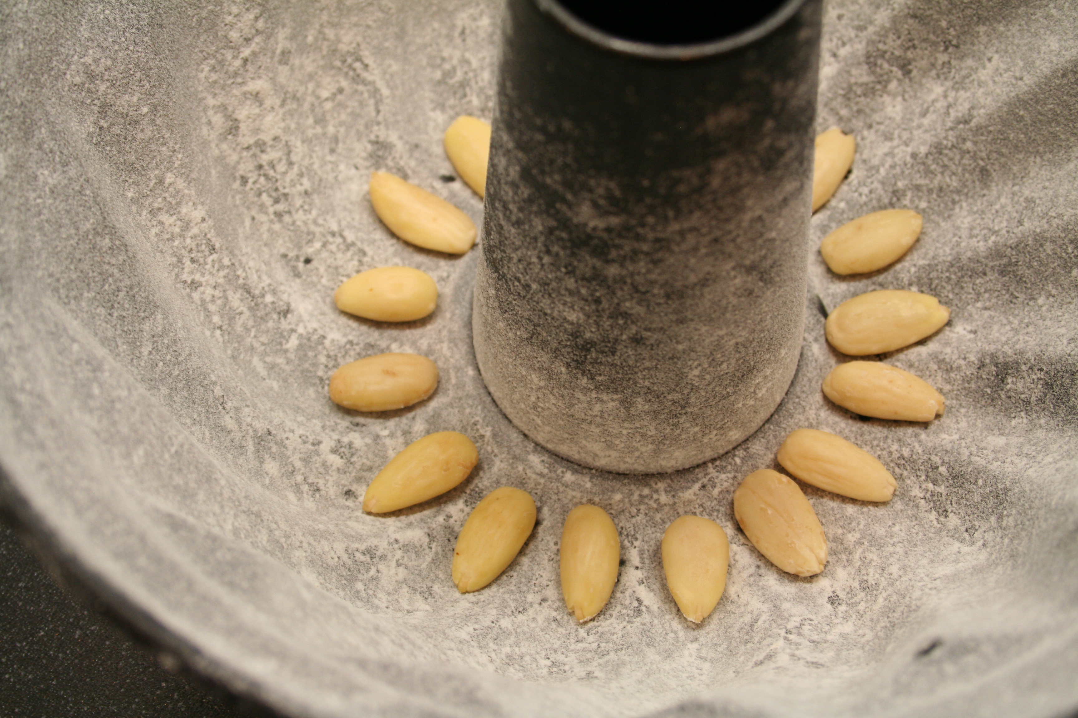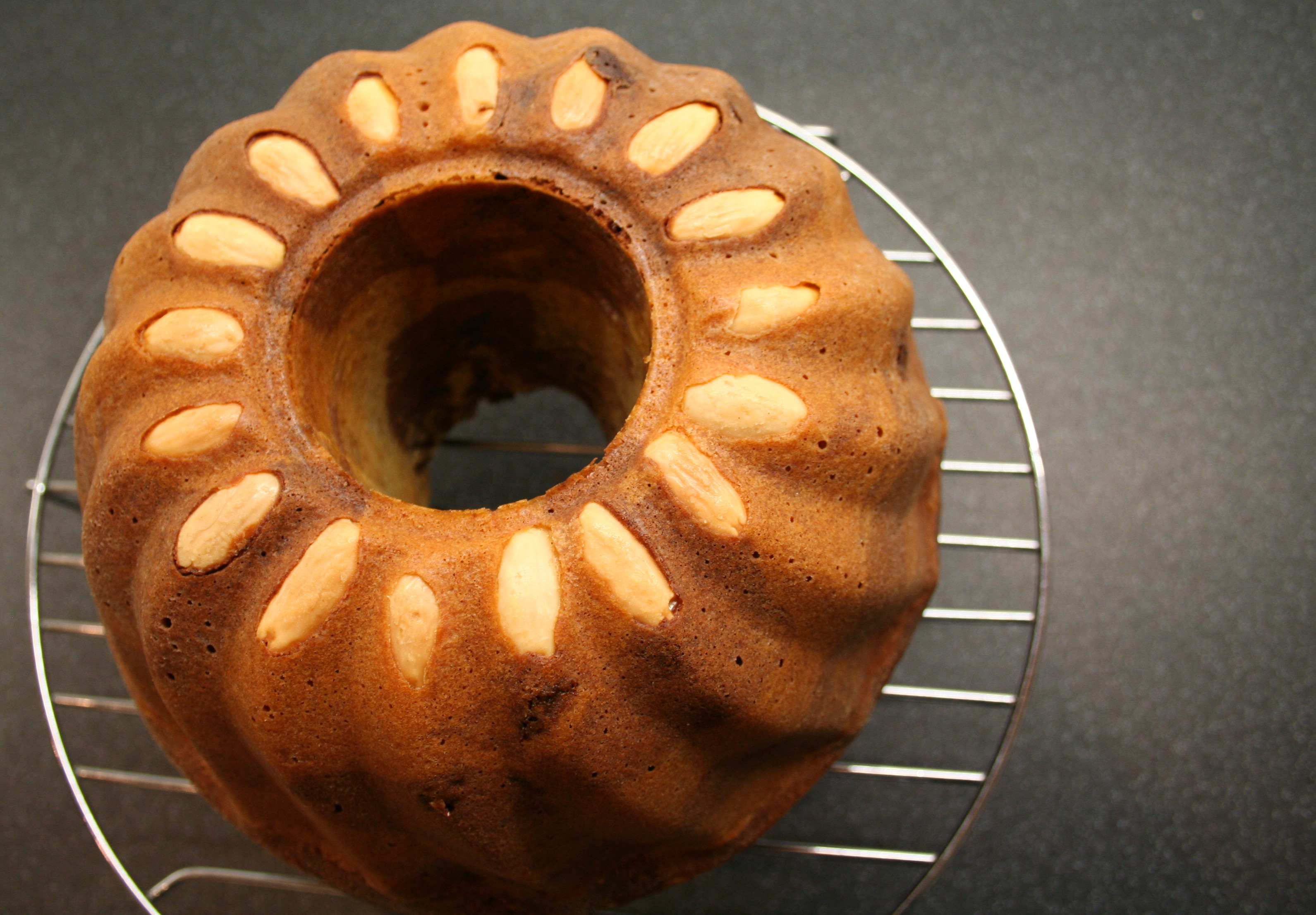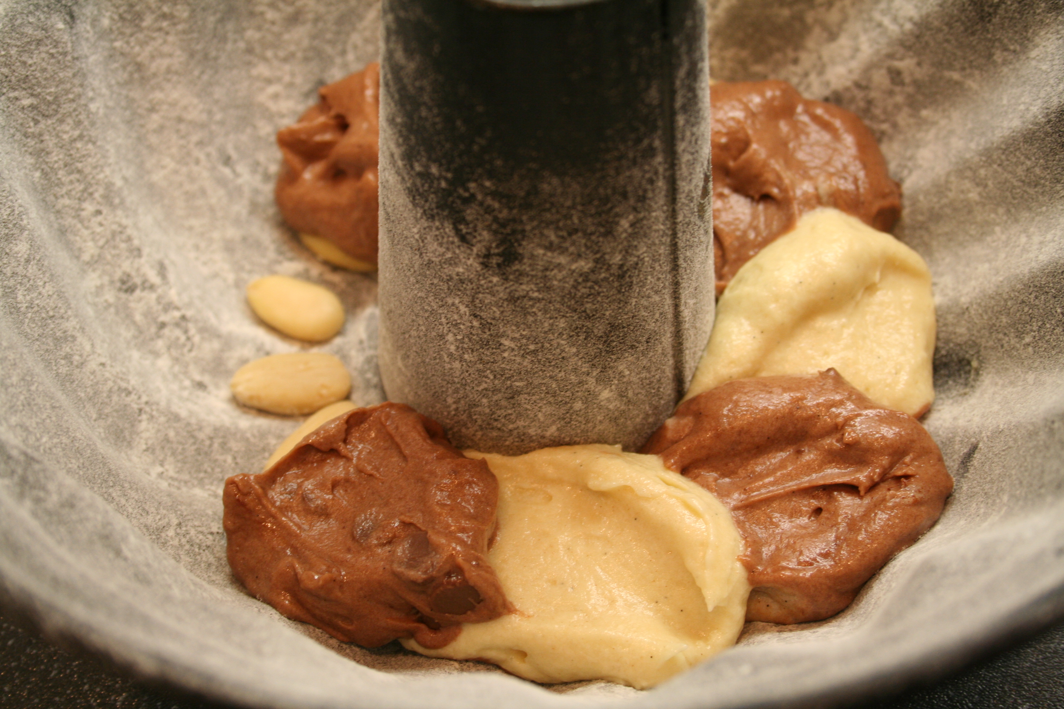 Preheat the oven to 180°C (160°C for fan oven). Grease and flour a gugelhupf (bundt) cake form. Place an almond in the each of the grooves at the bottom of the cake form.