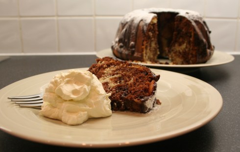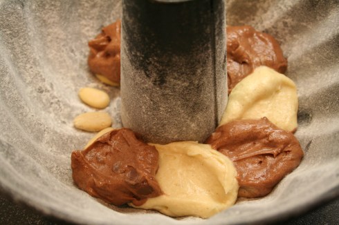 Note: The gugelhupf is rather versatile – instead of chocolate chunks you could add raisins or nuts or other dried fruit. You could also make it all vanilla or all chocolate. Decorate with melted chocolate or simply a dusting of icing sugar (or both!).