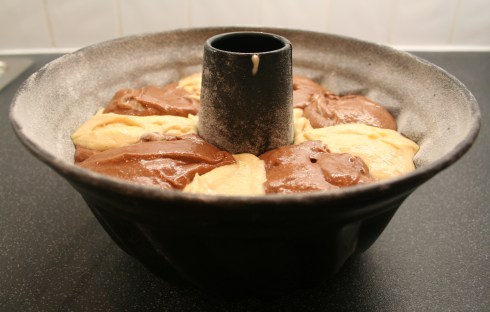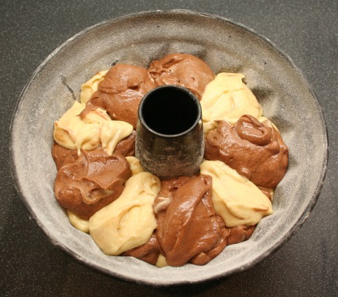 Alternating between the chocolate and vanilla batter, drop one spoonful at a time into the cake tin until all the batter has been used. Gently knock the tin on the kitchen counter so that the mixture settles into the tin.