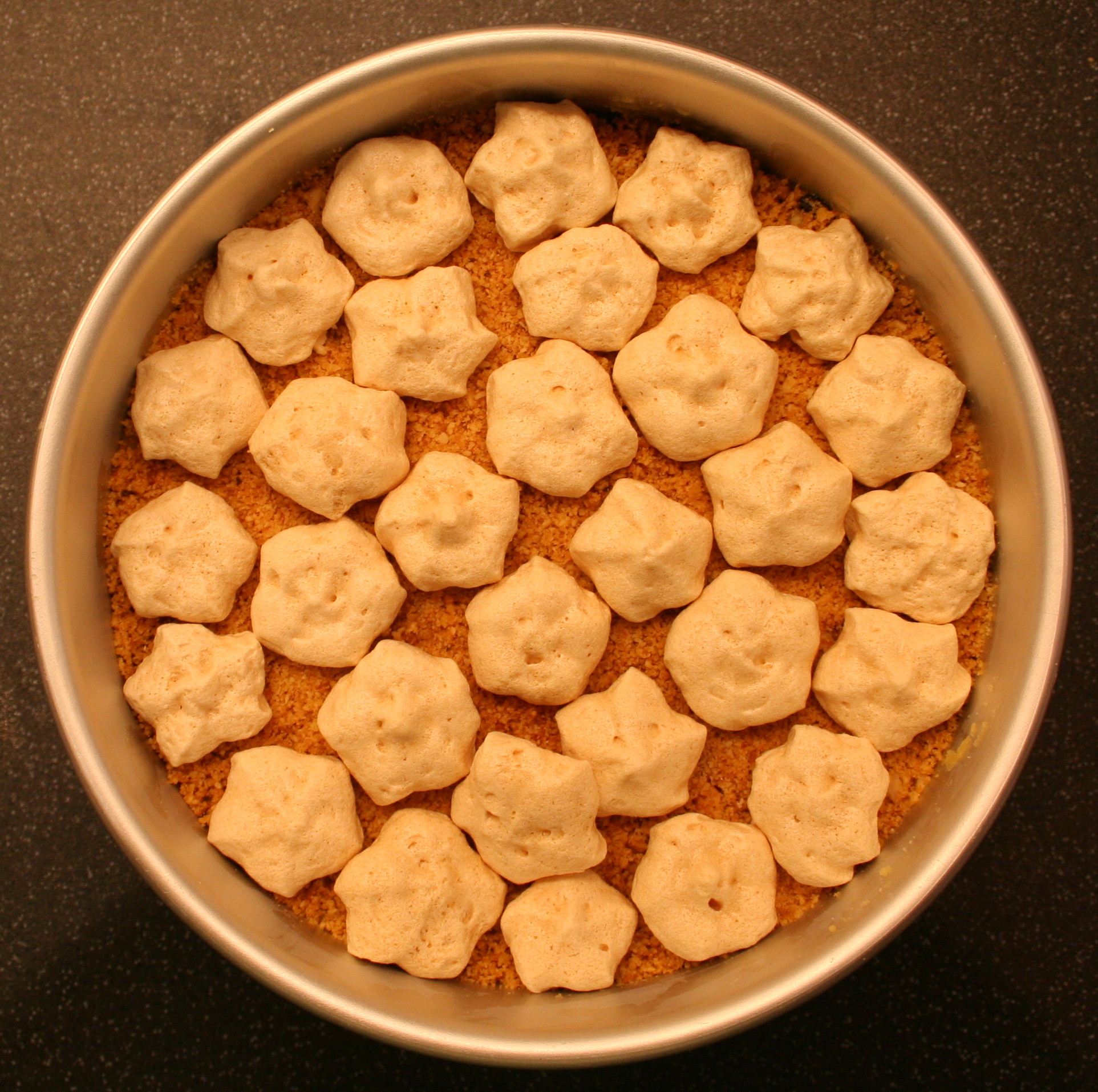 In a separate bowl with clean beaters whisk the egg whites until stiff. Add the vanilla extract. Gradually whisk in the remaining 100g castor sugar until the mixture is stiff and glossy. Add the meringue mixture to the cream cheese mixture and mix thoroughly. This can be done fairly vigorously – don’t worry about knocking the air out of it.