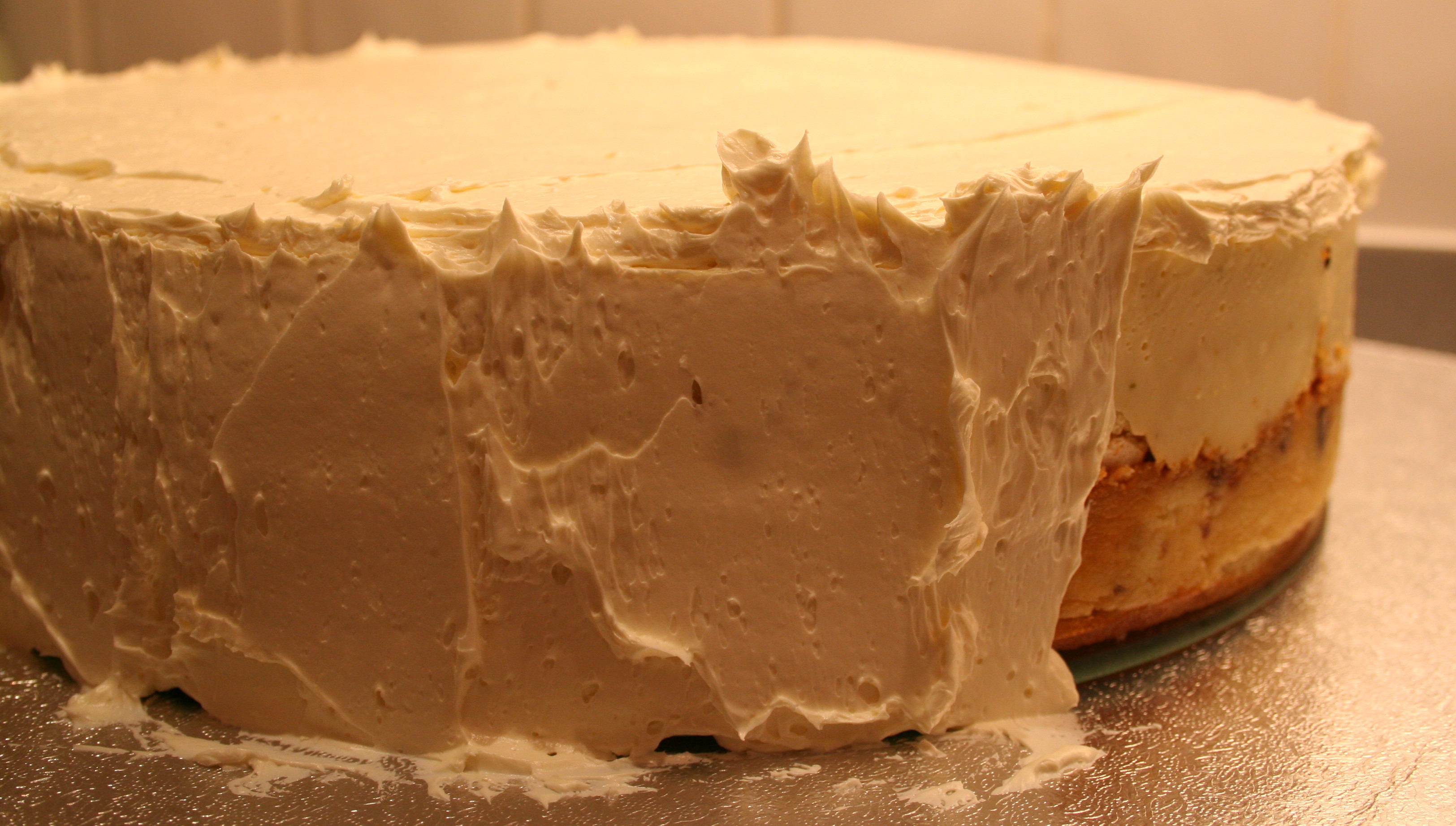 I’ve only just about managed to get the stickiness off my revolting rented linoleum kitchen floor. In the franticness that led up to the completion of the cake all manner of meringue, cake mixture, sugar, eggs and frosting ended up splattered and trampled into the floor.