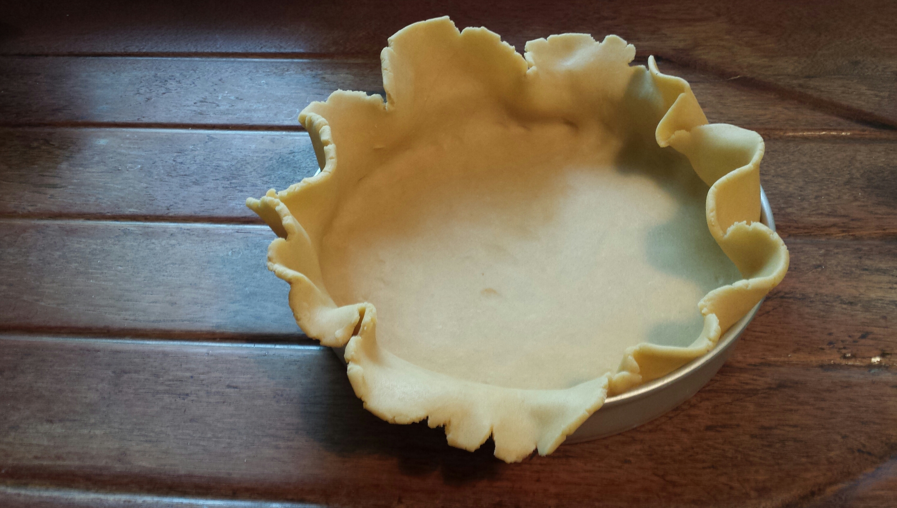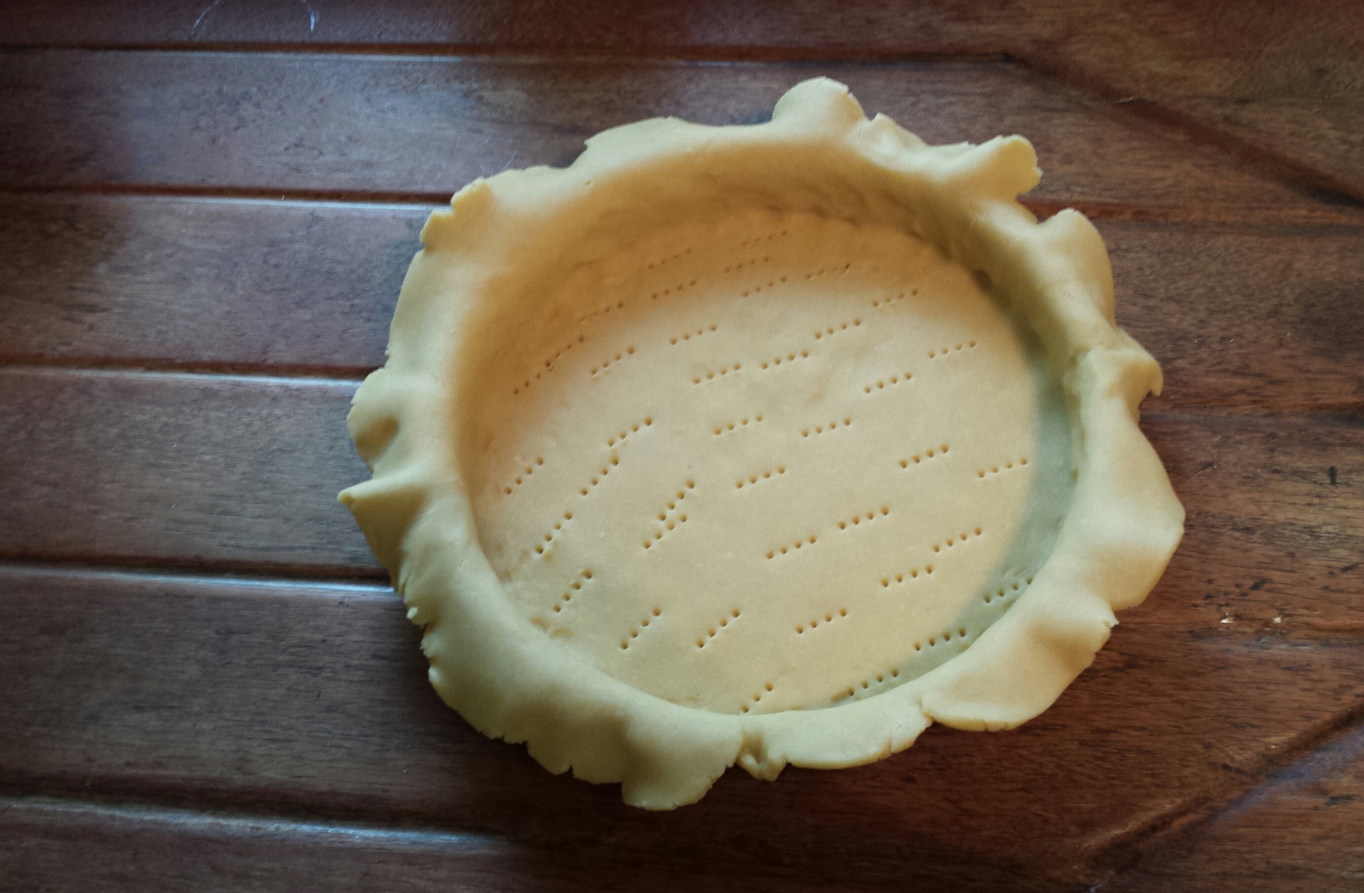 Preheat the oven to 190°C (170°C in a fan oven). Grease a tart tin with butter (I used a 10″ tin, although you can use a slightly bigger one as I had some tart mixture left over). Roll the dough out to about 3mm thick and transfer to the tart tin. Allow the edges of the pastry to hang over the edge of the tin until baked as it will shrink. Prick the pastry with a fork.